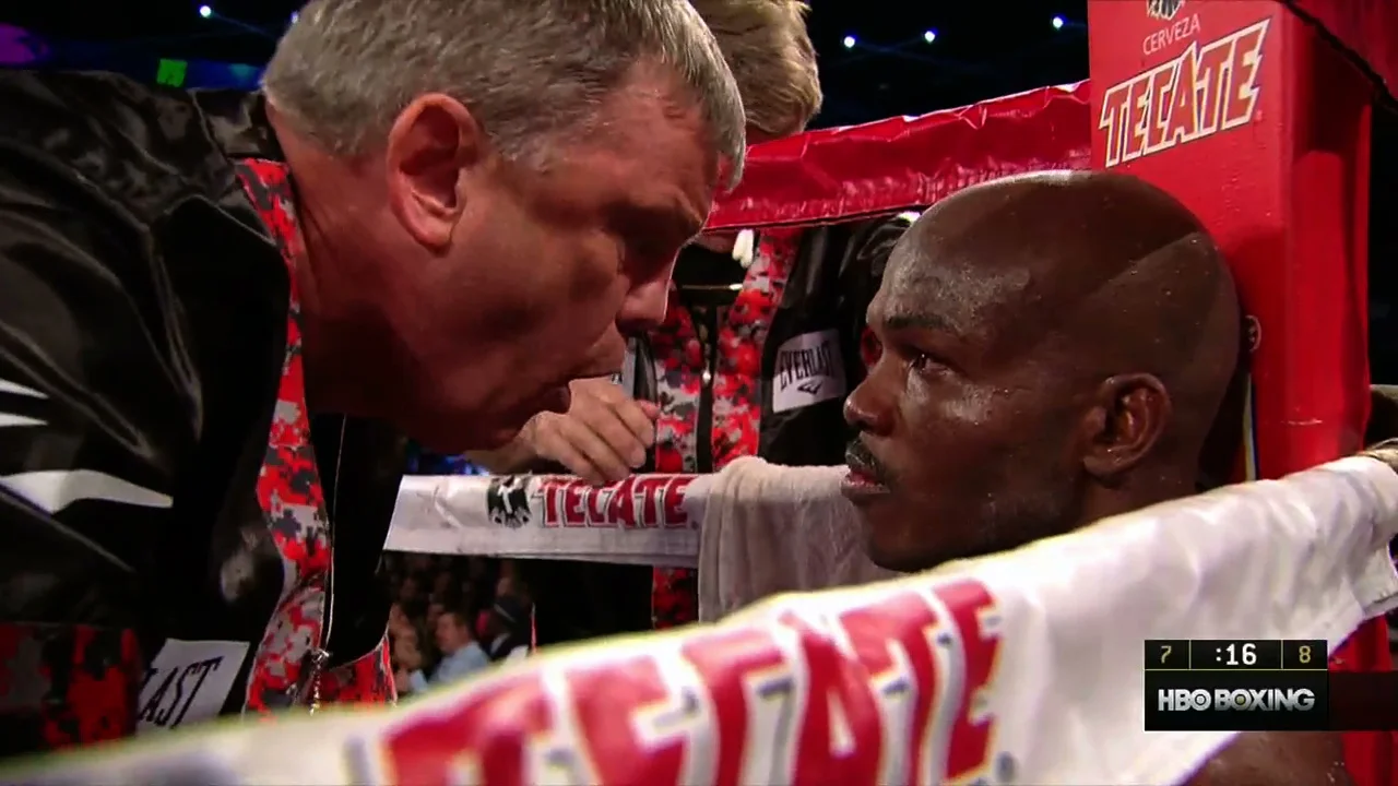 THOSE OF YOU, WHO WERE PRIVILEGED ENOUGH TO WATCH TIMOTHY BRADLEY'S PERFORMANCE LAST NIGHT, WOULD HAVE NOTICED A SIGNIFICANT DIFFERENCE IN BRADLEY'S FIGHTING STYLE. MOST OF THIS WAS DUE TO, THE TRAINER PICTURED ABOVE, TEDDY ATLAS. NOT ONLY, DID ATLAS RESHAPE BRADLEY AS A FIGHTER, BUT, IF YOU WATCHED THE FIGHT LAST NIGHT, HIS MOTIVATIONAL SPARK WAS AMAZING. THAT LOOK THAT BRADLEY GAVE ATLAS, IN THE PHOTO ABOVE, IS THE SAME LOOK BRADLEY GAVE ATLAS ALL NIGHT. BRADLEY WAS ATTENTIVE, WIDE EYED, AND THE LOOK OF BELIEF AND EAGERNESS TO FULFILL HIS DESTINY, WAS NOT ONLY APPARENT IN HIS EYES, BUT, IN HIS PERFORMANCE AS WELL. BRADLEY, WENT ON TO WIN VIA K.O., BY BODY SHOT, AND IN TURN RETIRING HIS OPPONENT. GREAT PERFORMANCE, AND I LOOK FORWARD TO SEEING BRADLEY GETTING SHARPER AS TIME GOES ON.
